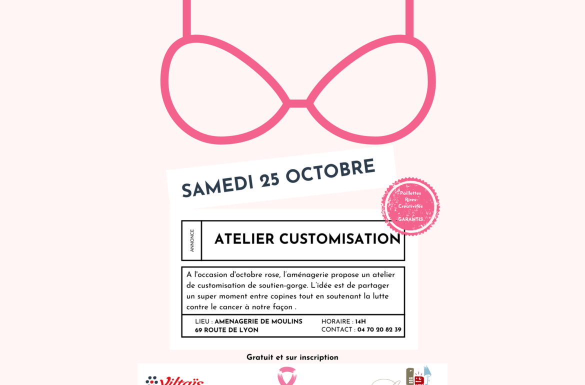 A l’occasion d’octobre rose, L’Aménagerie propose un atelier de customisation de soutien-gorge qui se tiendra le samedi 25 octobre !